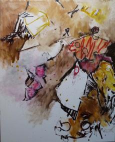 21 septembre 2013 - J'ai du provisoirement arrêter de peindre non que le ciel de l'atelier me fut tombé sur la tête, mais en raison d'une chute dans les blancs rochers calcaire qui, quelque part, abritaient une grotte dans laquelle se trouve un bloc dont une des parois présente gravé un bouquetin à six pattes . J'ai trouvé l'entrée de la grotte mais j'ai fait demi tour en me rendant compte que si je pouvais sans doute y rentrer, je risquais de ne pouvoir en sortir sans risque majeur ( paroi verticale ). C'est en tournant le dos au danger que la chute, un peu plus loin , m'attendait. C'est bien ainsi que va parfois le détour des choses .